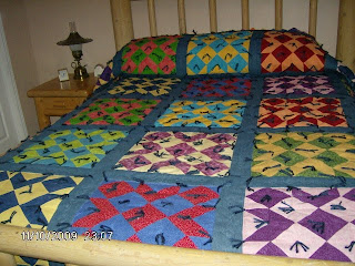 I started thinking about quilting and what emotions it brought, so I thought I wanted something of my own. Of course, I didn't bother to get directions or ask for help, I never do and then am always astounded that things don't work out right. I just cut and pieced as I went. I often wondered what would Betty do? She may have liked the colors but she sure would have advised me against the folly that I was heading into. I decided that I would like to make my creation a "Levi" quilt because the squares looked like bandanas to me. Then I decided to back it will levi and then to hand quilt around the edges and in between the squares. Question: how do you quickly hand quilt two layers of levi material with batting? Trick question, you don't!!. I soon found that it was impossible, but I still wanted to do it (sure, like a machine quilting it isn't good enough!) so there are ten's of thousands of individual stitches around each block, between them and around the edges, looking OK on the top and TERRIBLE on the bottom. It is king sized and must weigh about 40-50 lbs. It is a monster; I sincerely wonder if a small child would not smother under the weight of it on a bed!!! It is done for the most part, I just have to find a machine strong enought to sew the binding together. It works for our Lincoln Bedroom.